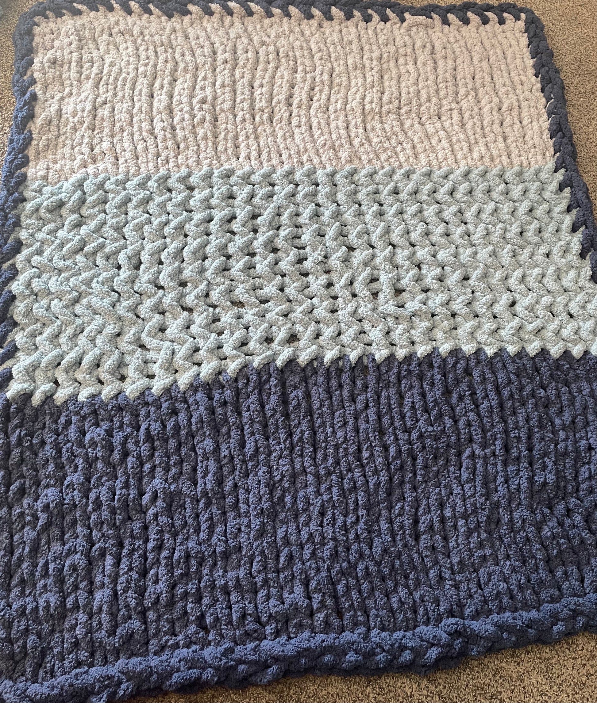 Wrap yourself in warmth and timeless texture with this hand knit blanket, thoughtfully made for cozy everyday living. Featuring a modern diagonal color-block design, this blanket blends soft neutral gray, calming light blue, and deep navy tones for a versatile look that complements any home décor style.